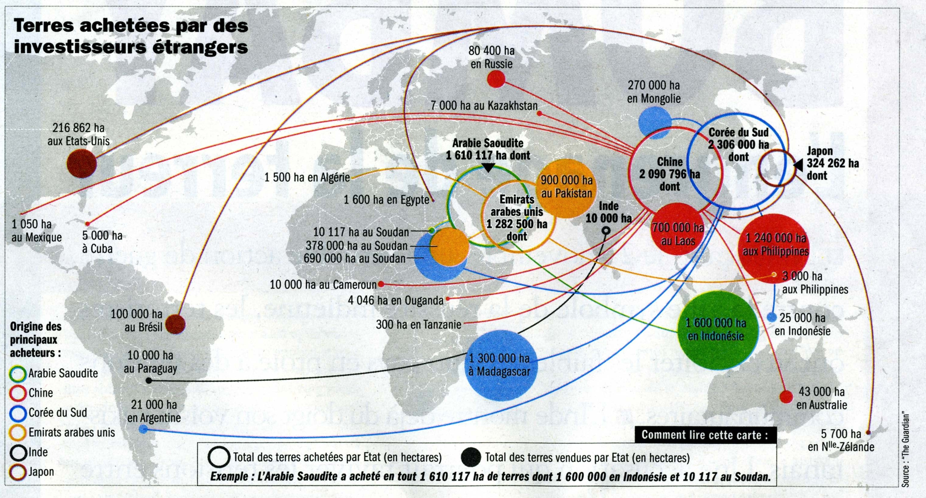 La Corée du Sud achète 2 millions d’hectares ( 1.300.000 ha à Madagascar et 700.000 ha au Soudan); la Chine achète 1,9 million d’hectares ( 1.200.000 ha aux Philippines, et 700.000 au Laos); l’Arabie Saoudite achète 1.600.000 ha en Indonésie; les Emirats Arabes Unis 1,3 million d’hectares ( 900.000 ha au Pakistan et presque 400.000 ha au Soudan); le Japon achète 300.000 ha ( 100.000 ha au Brésil et plus de 200.000 aux USA).